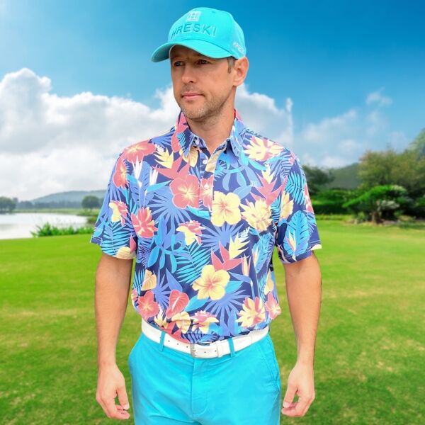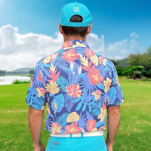 Yellow and Orange Tropical Flowers and Light Purple Palm Leaves on Dark Background Golf Shirt - Hreski 233