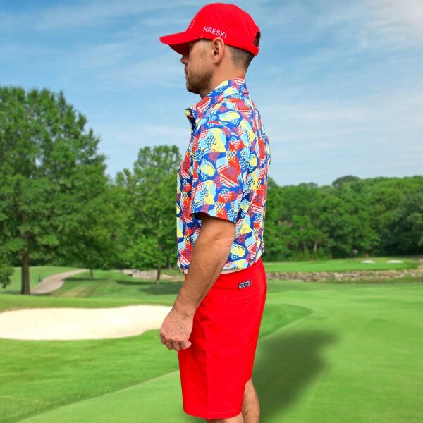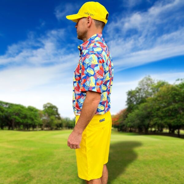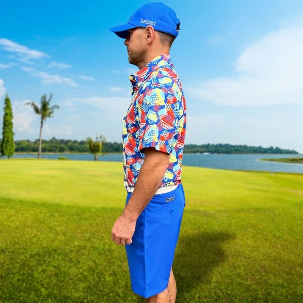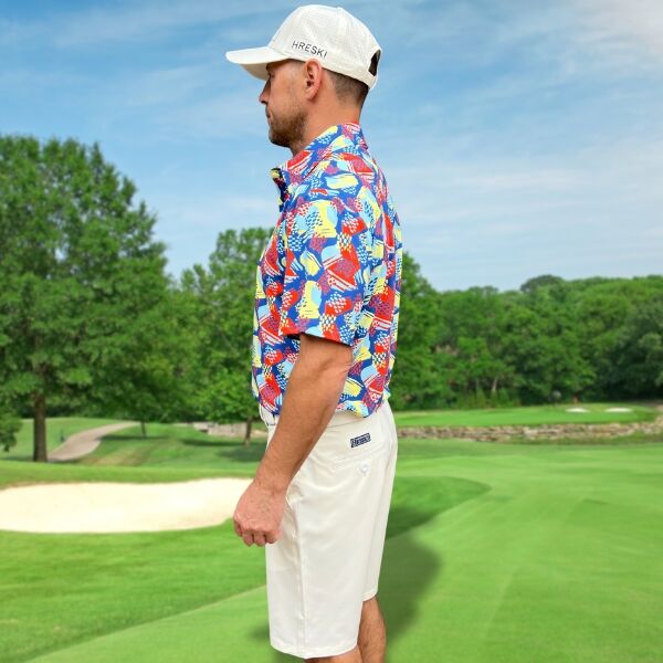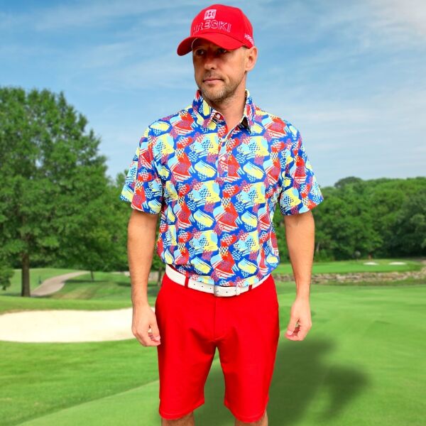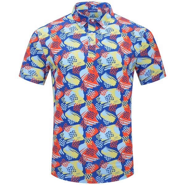 Mix of Light Blue, Yellow, and Red-Orange Brushstrokes on Blue Background Golf Shirt – Hreski 238
