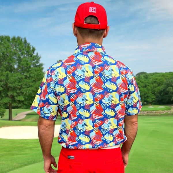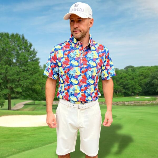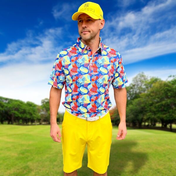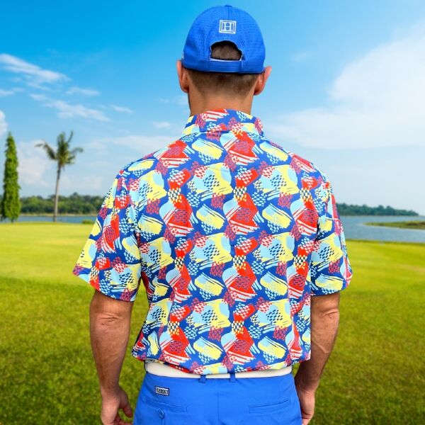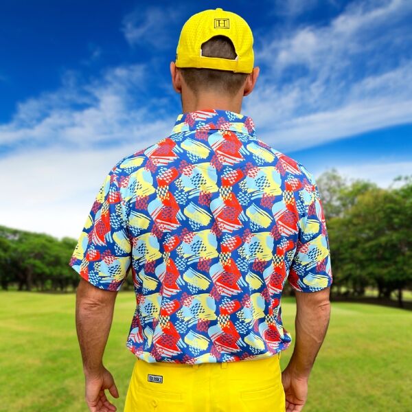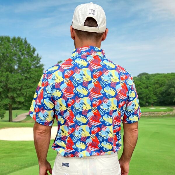 - Custom Design: Mix of Light Blue, Yellow, and Red-Orange Brushstrokes on Blue Background Golf Shirt
