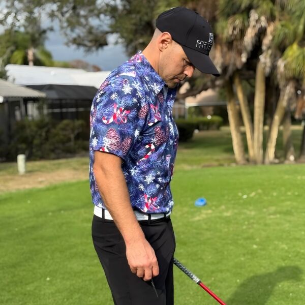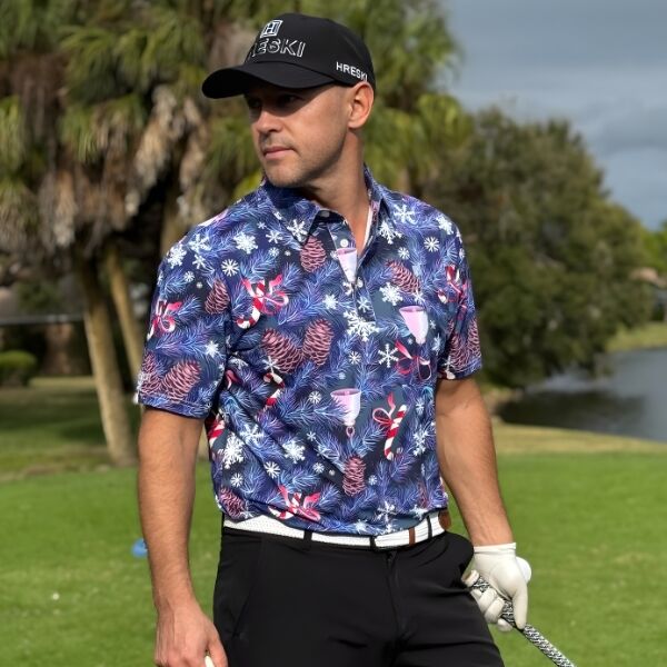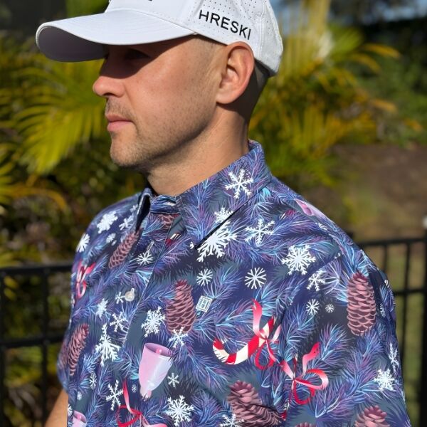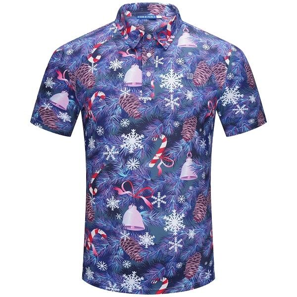 Snowflakes, Candy Canes, Bells and Pines on Blue-Gray Background Golf Shirt – Hreski 210