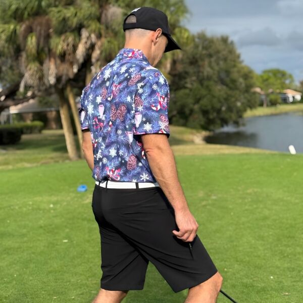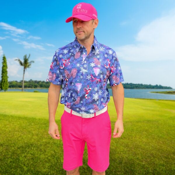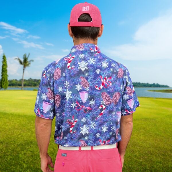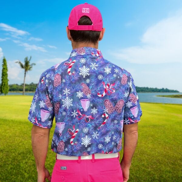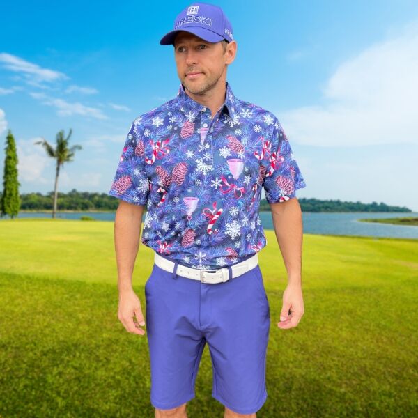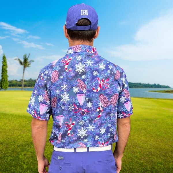 • Custom Design: Snowflakes, Candy Canes, Bells and Pines on Blue-Gray Background Golf Shirt