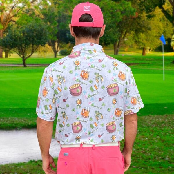 - Custom Design: St. Patrick’s Design with Pots of Gold, Steins, Clover, and Irish Flag on Gray Background Golf Shirt