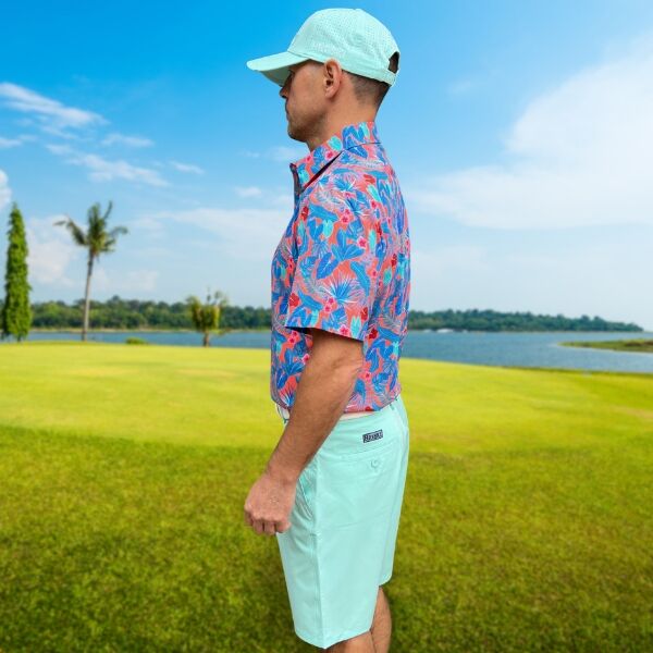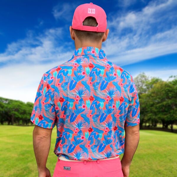 - Custom Design: Various Teal Palm Leaves and Hibiscus Flowers on Coral Background Golf Shirt
