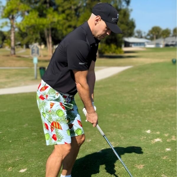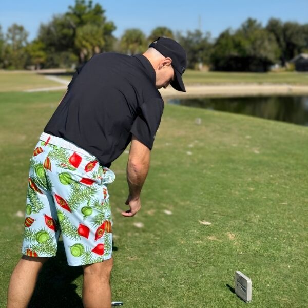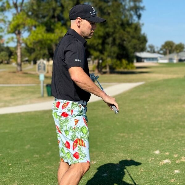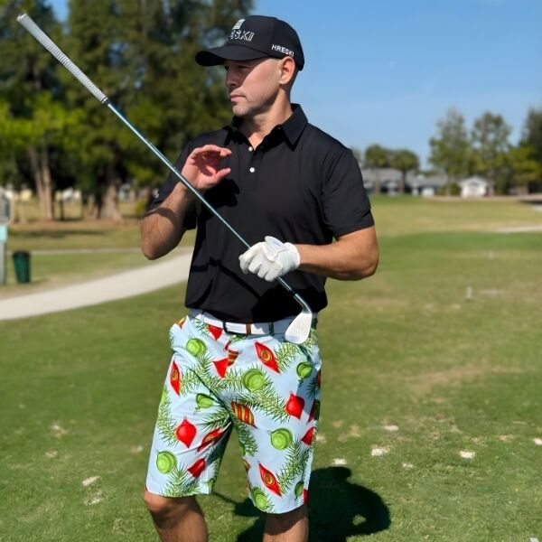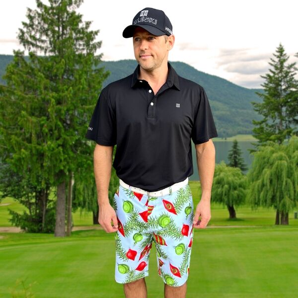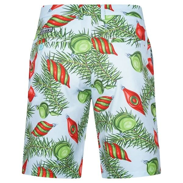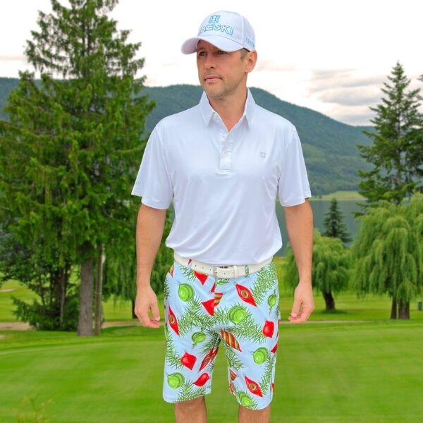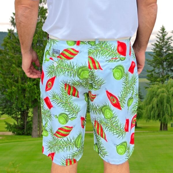 Red and Green Ornaments and Pine Needles on Light Blue Background Golf Shorts – Hreski 211