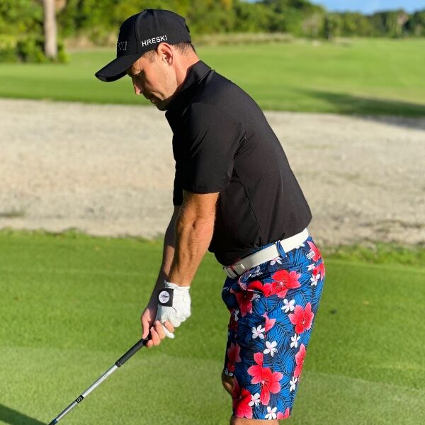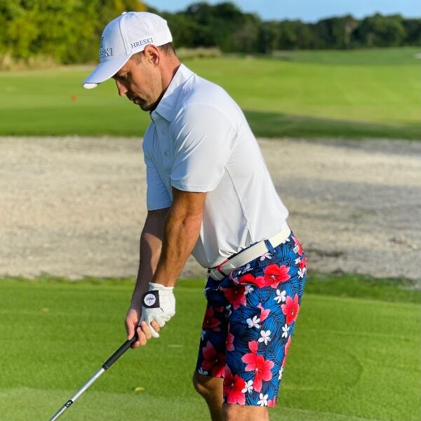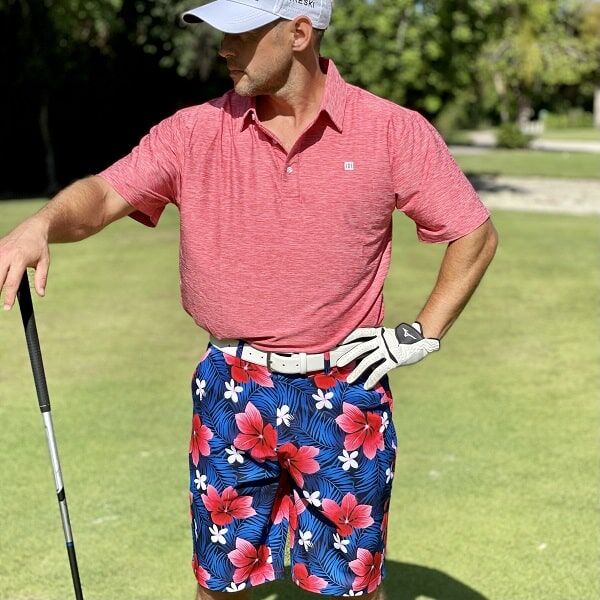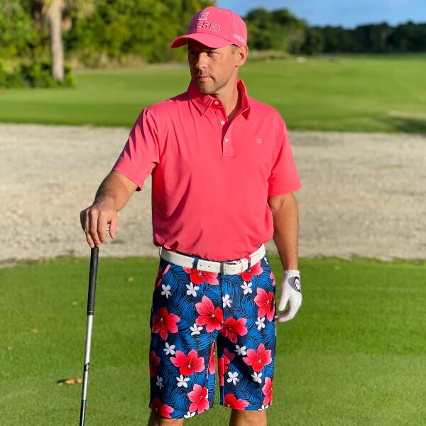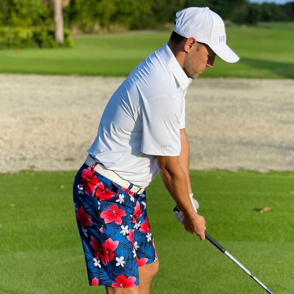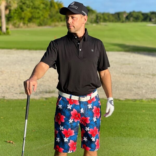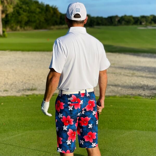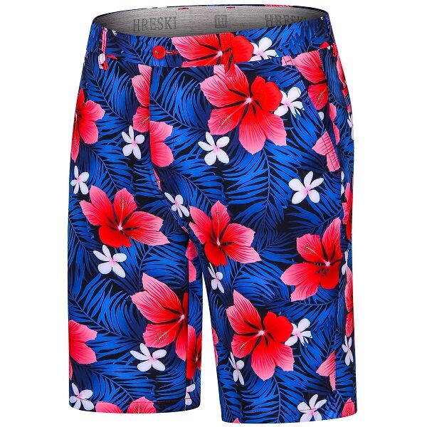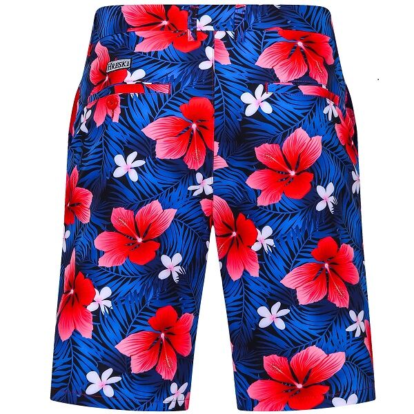 Red Hibiscus Flowers on Blue Palm Leaves Background Golf Shorts – Hreski 181