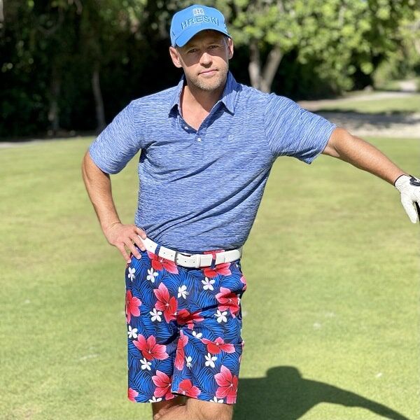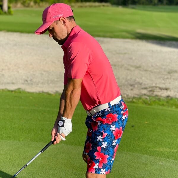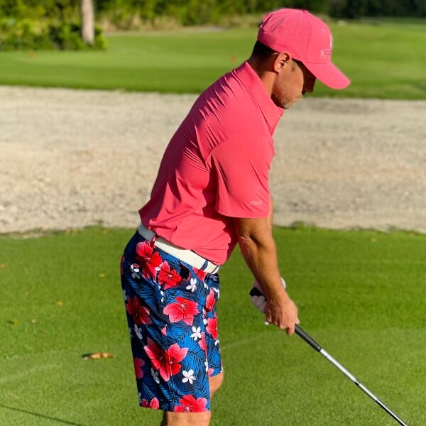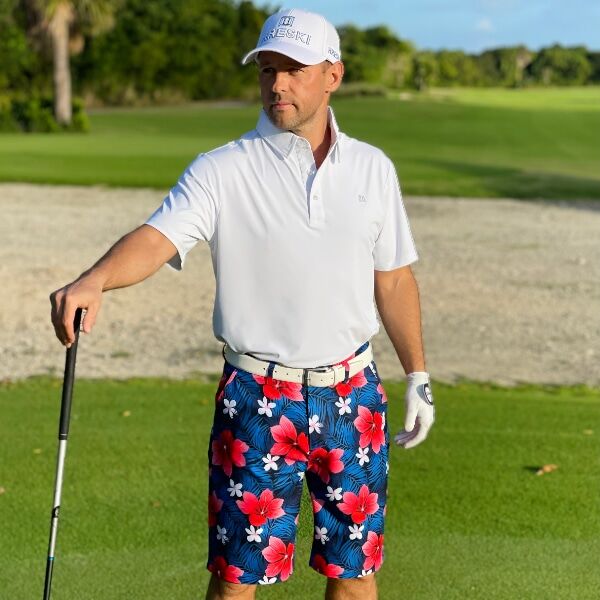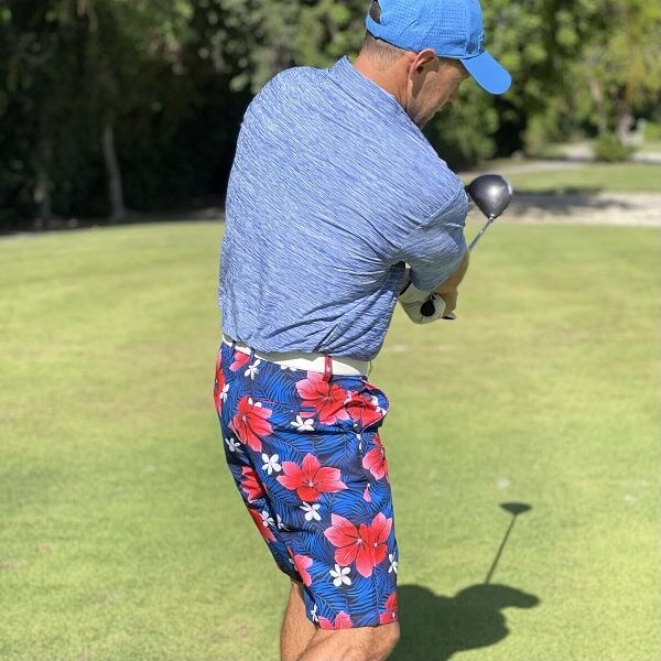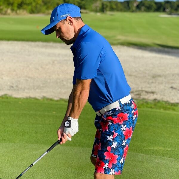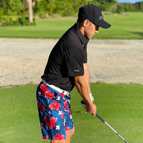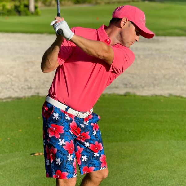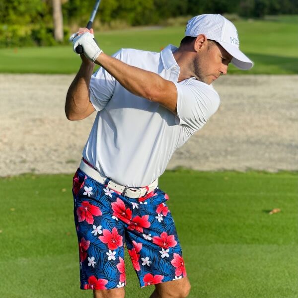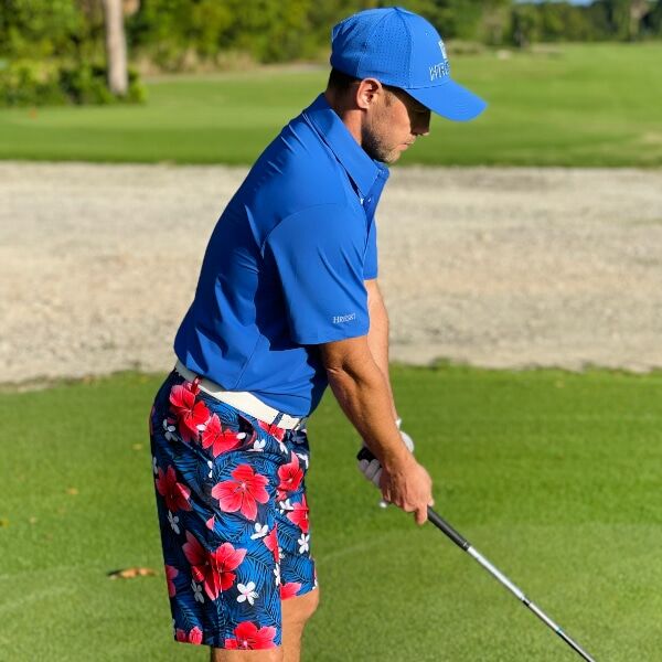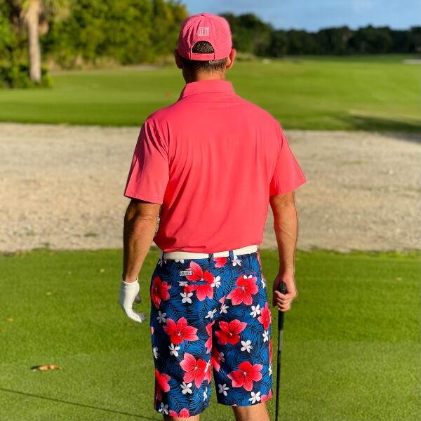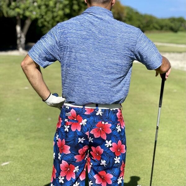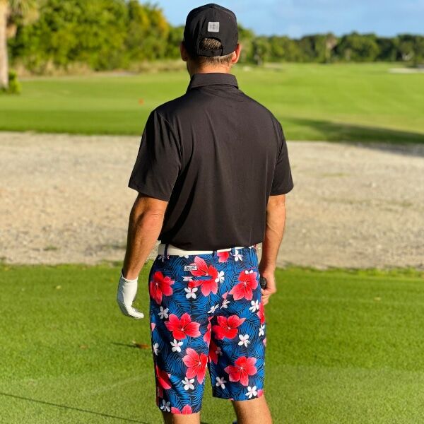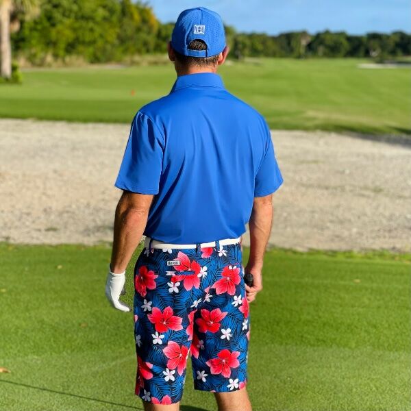 • Custom Design: Red Hibiscus Flowers on Blue Palm Leaves Background Golf Shorts