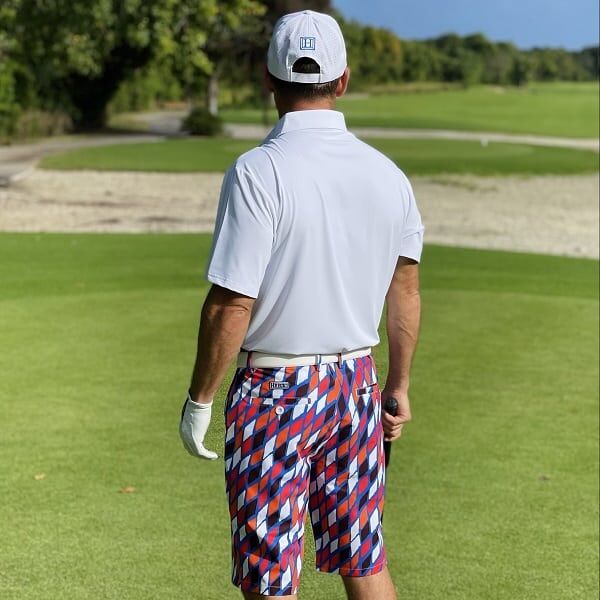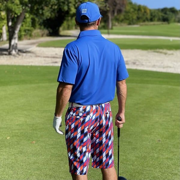 - Custom Design: Red, Orange, Black and White Diamonds on Blue Background Golf Shorts