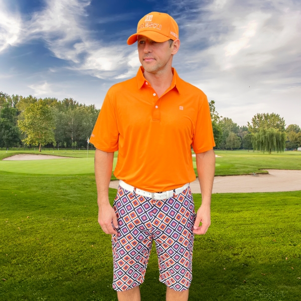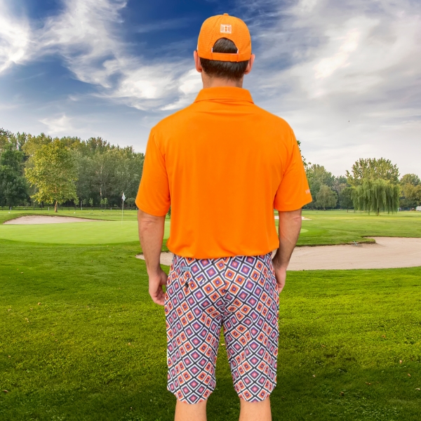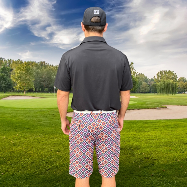 - Custom Design: White, Purple, and Orange Diagonal Squares on Black Background Golf Shorts