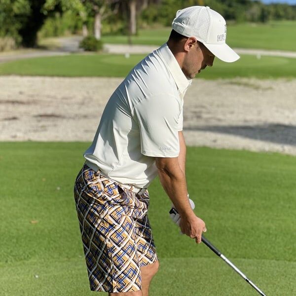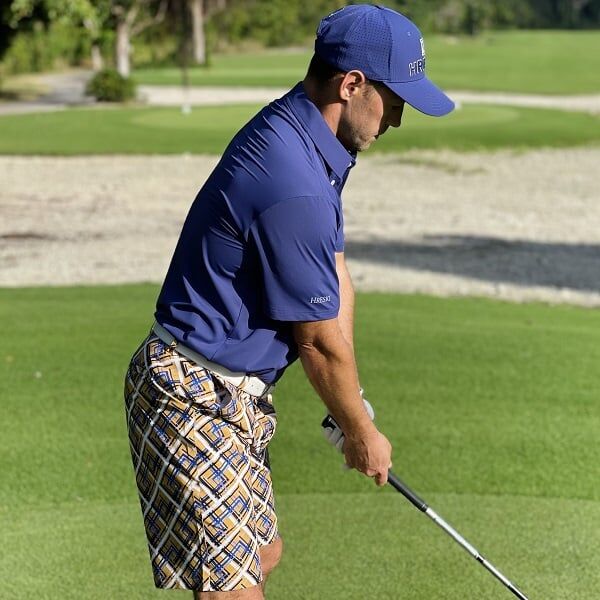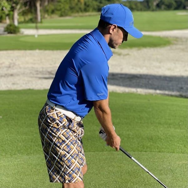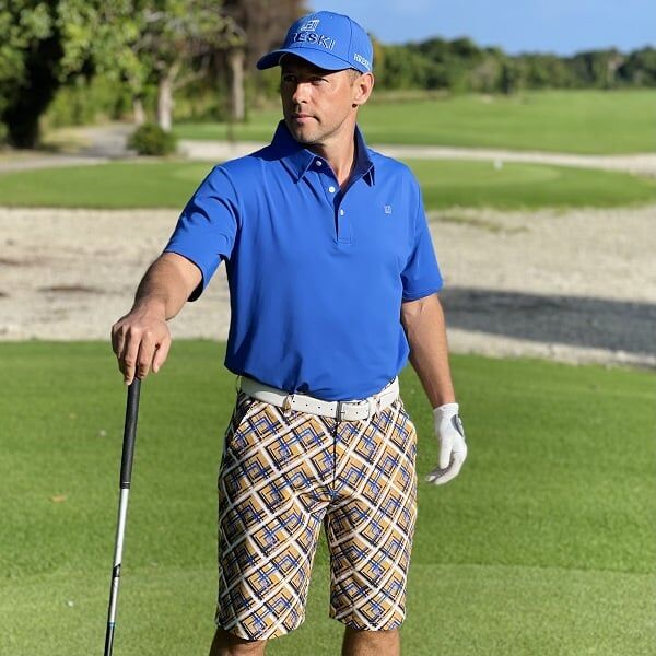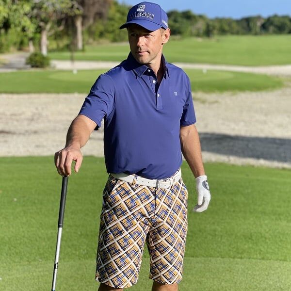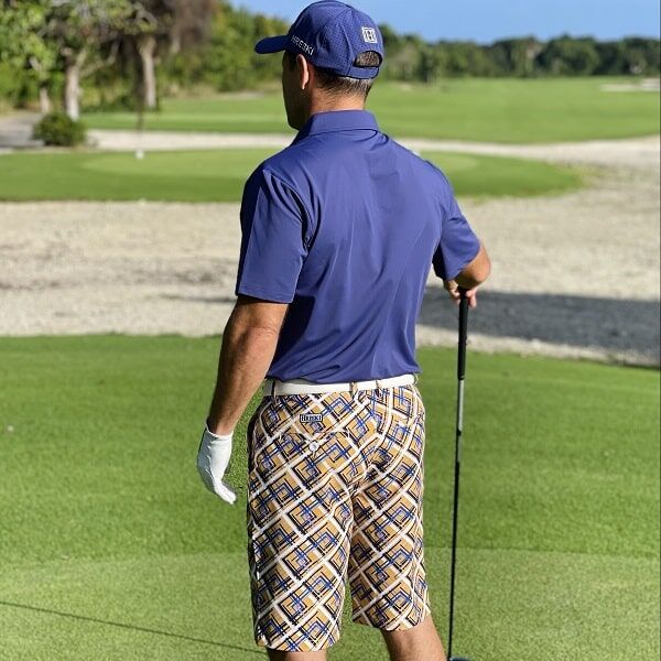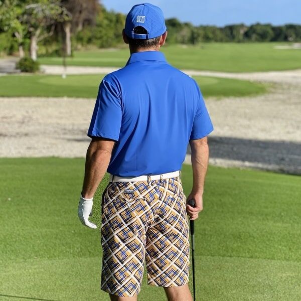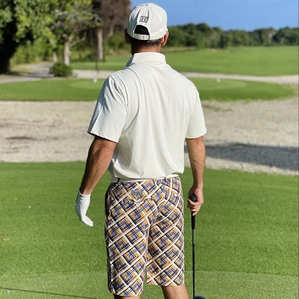 - Custom Design: Yellow Tiles with Blue, Navy and Black Streaks Golf Shorts
